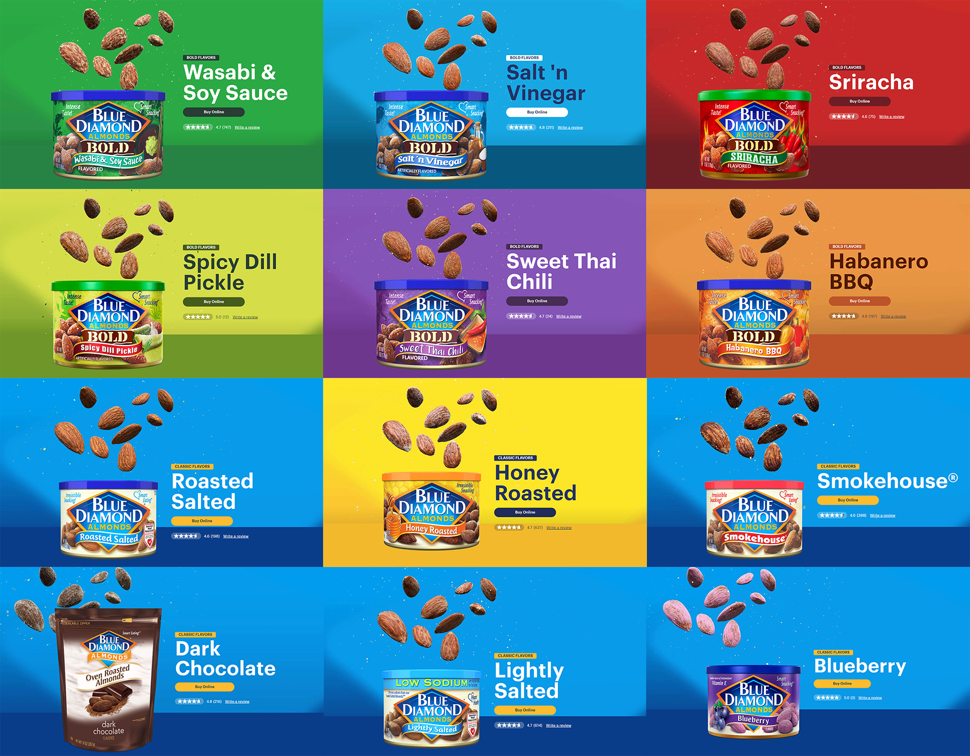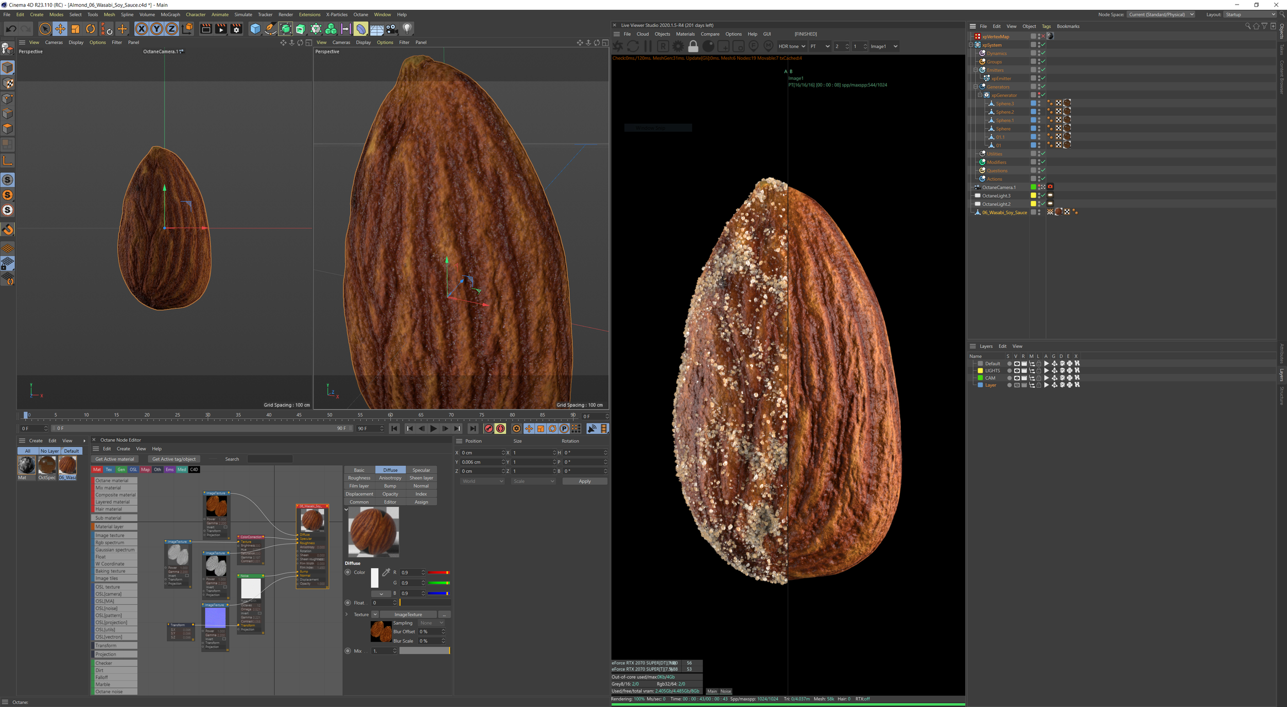Most of the various 3D-rendered almonds and their respective flavors. 14 different Flavors in total.